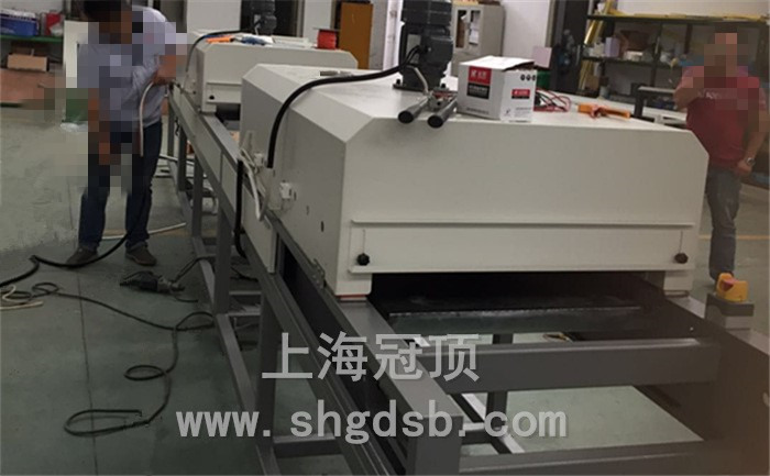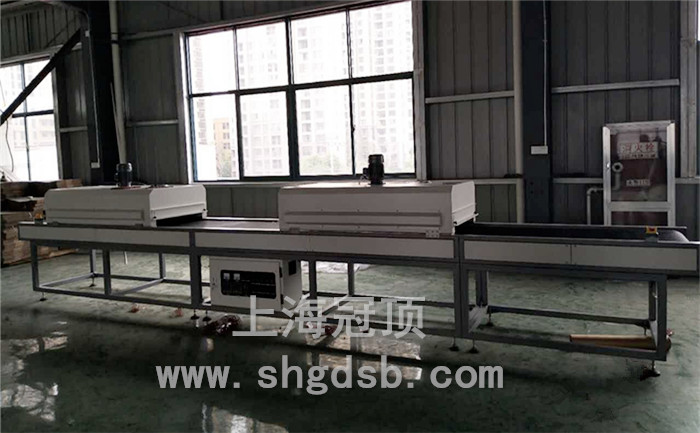 隧道式固化爐主要參數 總長6.5米、上料段0.5米,輸送帶寬度0.8米,第一段烘烤1.5米、第一下料區1.5米、第二段烘烤1.5米,第二下料區1.5米。